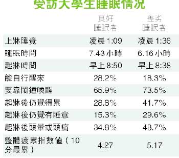 據(jù)香港明報(bào)報(bào)道,中大醫(yī)學(xué)院在06年2月至3月訪問了400名中大學(xué)生了解其睡眠習(xí)慣和質(zhì)素,發(fā)現(xiàn)多達(dá)57.5%屬于“差劣睡眠者”(poor sleeper)。當(dāng)中女性更占65.7%,此班學(xué)生平均每晚到凌晨1時(shí)半才睡,近半數(shù)人起床后會(huì)感到頭暈或頭痛,四成起床后仍覺累,絕大多數(shù)均要靠鬧鐘喚醒。