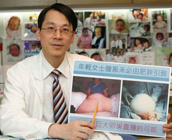 像王小姐的個案并不罕見。香港婦產(chǎn)專科醫(yī)生盧兆輝說,以他3、4年前在東區(qū)醫(yī)院的經(jīng)驗(yàn),每周也有4宗個案,一年約有200至250宗個案,不過未必每名患者的囊腫皆如此巨大,一般個案的囊腫直徑約10至20厘米。