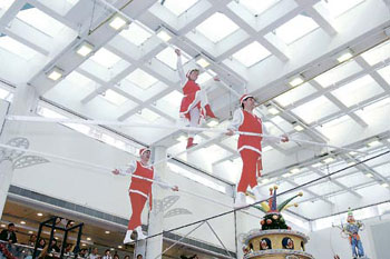 25歲的Jasmine是Peter的女兒,昨天她表演在鋼在線推手推車,走過10多米的距離。樣貌標致的Jasmine,一面手執(zhí)平衡桿,面帶笑容走過腳下的幼絲,臺下的觀眾卻為她“一步一驚心”。Jasmine說,她曾試過離開表演事業(yè),在外另覓工作,但始終心系腳下這條鋼線!笆冀K一家人 能一起工作,獲得安全感和快樂,是外面找不到的,而且我熱愛演出!(周淑蘭)