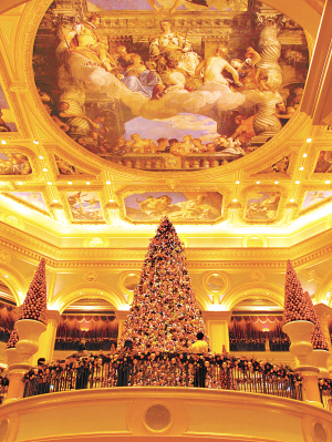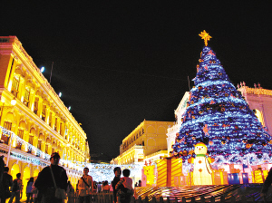 澳門的議事廳前地那一棵足有兩三層樓高的許愿樹燈飾會(huì)讓你眼前一亮,一層層藍(lán)盈盈小燈密密圍著,絲毫不會(huì)露出光裸電線,底下是制作頗為精細(xì)的大雪人,禮物堆,可愛得幾乎每個(gè)經(jīng)過(guò)的路人都忍不住要掏出手機(jī)去拍一張,小孩子更不用說(shuō)了,嚷嚷要媽媽放開手好讓他爬上去拆禮物,看得人忍不住要會(huì)心微笑。然后郵政局門口那一棵許愿樹也十分華麗,而且是很別出心裁地“長(zhǎng)”在了大門口,叫進(jìn)出的人都覺得自己是在天使庇佑之下似的,忍不住要在心里許個(gè)小小愿望。即使是在普通的非鬧市區(qū),馬路上也掛上了串串燈飾,顯得氣氛特別濃。至于各大娛樂(lè)場(chǎng)所里面的許愿樹,更是一棵賽一棵的漂亮,一層樓高的是小意思,兩層樓高的是普通規(guī)模,最夸張的是威尼斯人度假村,幾乎每隔一段距離就有一棵或大或小的許愿樹,上面還很細(xì)心地掛滿了蝴蝶結(jié)、許愿球、小禮物、小襪子……看得人又忍不住要掏手機(jī)來(lái)玩自拍,不過(guò)即使一棵一張,估計(jì)即使是512M的卡都會(huì)不夠用呢。