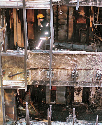大火撲滅后,消防員進(jìn)入火場調(diào)查。(圖片來源:蘋果日報)