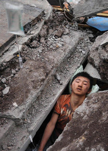 去年5月13日清晨6點(diǎn)多鐘,記者在北川中學(xué)的廢墟上,拍攝下了兩張照片:一個穿著黃色T恤、半昏迷的男孩,被夾在垮塌的教學(xué)樓預(yù)制板夾縫中,僅露出上半身;他的身邊,一個穿著藍(lán)色上衣的男孩,正為夾縫中的孩子拎著吊瓶。照片中的兩名男孩,就是后來被人們稱作“吊瓶兄弟”和“夾縫小子”的北川中學(xué)高一學(xué)生李陽和廖波。
