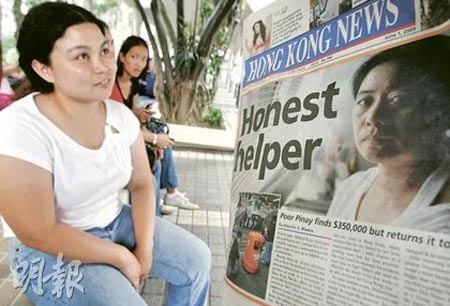 據(jù)香港《明報》報道,離鄉(xiāng)別井為兩餐,從菲律賓來港謀生的女傭Mildred Perez,不甘雇主對她做出的不法行為,訴諸法院,在候審期間不能另找工作,只靠拾荒維生,每天掙約38元生活費。有一天,她意外地得到一個可擺脫貧困的機會——在垃圾堆中拾獲35萬元巨款,但她把錢全數(shù)退還失主,雖然換來的只是一盒曲奇餅作答謝,但她并無后悔,繼續(xù)其撿破爛的日子。