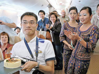 根據(jù)新加坡航空資料,約有10多名港人成為A380首航的見證人,當(dāng)中包括獨(dú)自登上航機(jī)的年輕人Francis Wu。昨日度過22歲生辰的Francis,正忙于以手提電腦輸入日志時,機(jī)組人員神秘地捧蛋糕走近,為他慶祝。其它乘客亦加入慶祝行列,一同拍掌唱生日歌,空姐亦特別送上生日卡,難怪Francis說:“今次是他人生中最好的一個生日!痹诿绹f金山City College修讀計算機(jī)科技的Francis表示,數(shù)月前父母問他今年希望收到什么生日禮物時,他說希望可乘坐A380的首航,于是父母以1250美元(約9750港元)為他投得機(jī)票。