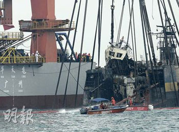 另有消息傳出廣州打撈局人員在晚上8時進(jìn)行打撈工序期間,在沉船拖纜機(jī)左右兩邊先發(fā)現(xiàn)2具尸體,其后在船艙再發(fā)現(xiàn)2具尸體,但由于暫時不適合搜救,所以港方搜救人員暫未將尸體撈起。