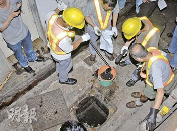 但街坊稱,兇案現(xiàn)場樓下的地產(chǎn)鋪和牛仔褲鋪的污水渠,近日傳出如“死老鼠“般惡臭。渠務(wù)署職員8日與探員到石硤尾現(xiàn)場一帶的沙井搜查,探員倒入化學顯影劑后利用弧光燈搜索,撈起兩團懷疑碎肉,又收集了4盆淤泥,全部帶返警署調(diào)查。