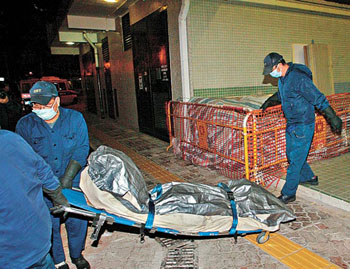 仵工將墮樓中大女生的尸體移送殮房。(圖片來源:蘋果日報)
