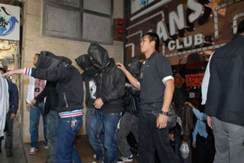警員進(jìn)入酒吧后實(shí)時(shí)控制場(chǎng)面,繼而展開(kāi)搜查,在店內(nèi)3間貴賓房?jī)?nèi)先后搜出3把用紗布纏著刀柄長(zhǎng)近3呎的開(kāi)山刀及3柄牛肉刀,拘捕40男女,用膠塑帶兩人一組綁著押上警車(chē)帶署調(diào)查。