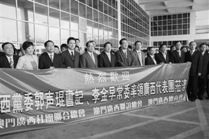 中新網4月21日電 據澳門日報報道,由廣西壯族自治區(qū)黨委書記郭聲琨率領的訪澳招商考察代表團一行,20日上午10時許經外港碼頭抵澳,澳門經濟財政司司長譚伯源、澳門廣西社團聯合總會會長何玉棠、澳門廣西總商會會長羅盛宗,以及兩個總會約500名會員、鄉(xiāng)親,在場歡迎廣西代表團的到來。