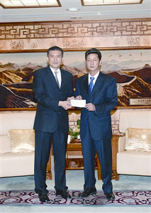 14日共有30多個(gè)單位到中聯(lián)辦送交善款,中聯(lián)辦主任白志健,副主任徐澤、陳啟明等接收款項(xiàng)。