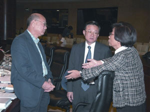 圖:曹其真、徐偉坤、鄭志強(qiáng)交換意見(jiàn)。(圖片來(lái)源:澳門日?qǐng)?bào))