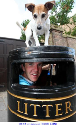中新網(wǎng)7月8日電 據(jù)臺灣“今日新聞網(wǎng)”7日報道,英國一位知名的街頭藝人查理卡維(Charlie Cavey)總是躲在垃圾桶里自彈自唱。但這種表演方式行動不便,賞金時常被偷走或搶走,于是最近找來一只杰克羅素犬“歐比”(Obi)幫他把風(fēng)。歐比乖巧的模樣,令人聯(lián)想到在唱片上有超過100年歷史的知名LOGO。