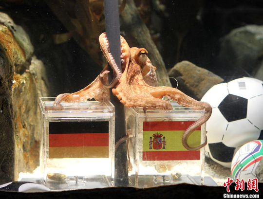 中新網(wǎng)7月9日電 德國神奇章魚保羅,準確預測世界杯準決賽西班牙擊敗德國,締造世界杯戰(zhàn)果預測六連中完美紀錄。據(jù)香港《星島日報》報道,一名賭徒“不信邪”,押注德國,結(jié)果輸?shù)魵v來世界杯最大額賭注五十萬歐元(約430萬元人民幣)。德國隊落敗也令保羅受到德國球迷的“追殺”,西班牙則卻歡迎它“移民”。