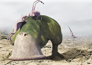在霍金的宇宙中,火星、月球等類地行星上生活著兩只腳的食草動物。它們能利用吸塵器般的巨型嘴巴從巖石的縫隙中吸食食物。類地行星上還存在類似蜥蜴的食肉動物,雙方偶爾爆發(fā)獵食大戰(zhàn)。