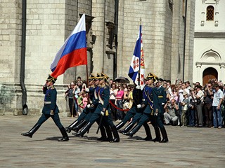 自2005年起,在氣候轉(zhuǎn)暖的4-10月,每逢周六中午克里姆林宮前就會進(jìn)行總統(tǒng)衛(wèi)隊步兵和騎兵的換崗儀式。其中,每月的前三個周六在克里姆林宮廣場進(jìn)行,剩下的在紅場進(jìn)行。(梁旭)