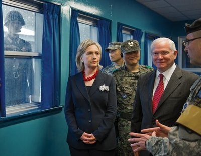 21日,韓美兩國(guó)外長(zhǎng)和防長(zhǎng)對(duì)板門(mén)點(diǎn)的訪問(wèn)受到了不亞于“2+2”會(huì)談的高度關(guān)注。希拉里和蓋茨也受到朝鮮士兵的“怒目相迎”。