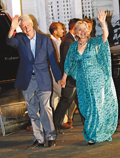 到了前晚 11時,希拉里終于出現(xiàn)了。兩夫婦手挽手,出席晚宴彩排,完畢后返回酒店時,不禁露出燦爛笑容,向圍觀的群眾揮手。