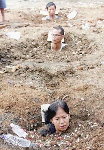 中新網(wǎng)8月3日電 據(jù)《明報》報道,印度尼西亞雅加達一個貧民窟的居民,2日將自己埋入泥土,僅伸出頭部,以抗議政府強行拆遷。