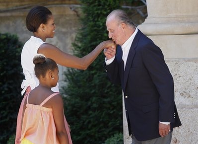 據(jù)報(bào)道,米歇爾和薩莎在當(dāng)?shù)貢r(shí)間8日下午不到1點(diǎn),抵達(dá)西班牙國(guó)王卡洛斯和王后索菲婭度假的馬略卡行宮。國(guó)王、皇后親自在門(mén)前迎接。