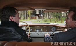在短時(shí)間的交談之后,梅德韋杰夫和施瓦辛格坐上淺奶油色“海鷗”牌轎車,由梅德韋杰夫親自駕車,一起前往斯科爾科沃。