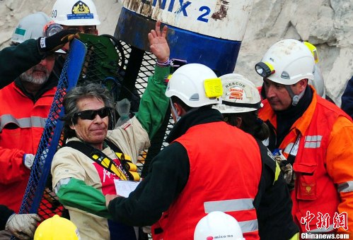 據(jù)報(bào)道,快到當(dāng)?shù)貢r間13日上午9點(diǎn)時,現(xiàn)年56歲的喬治.加利古洛斯(Jorge Galleguillos)順利升井,成為智利圣何塞銅礦第11名被營救出來的被困礦工。