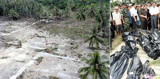 海底強震引起的致命海嘯發(fā)生兩天后,傷亡人數(shù)持續(xù)增加。最靠近震中、受創(chuàng)最深的明打威島煉,救難人員之前由于氣候惡劣無法登陸,裝載16噸的帳篷、藥品、食物和衣物的貨機,總算于27日下午抵達。由于挖墓的人力不足,仍可見到遺體散布在海邊及路邊。