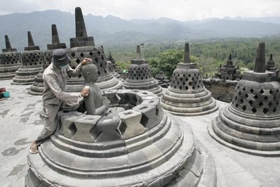 據(jù)報道,由于位于中爪哇省馬格朗縣日惹東北32公里的默拉皮火山26日開始大規(guī)模噴發(fā),位于鄰近地區(qū)的婆羅浮屠佛塔也被大量火山灰覆蓋。當(dāng)局從當(dāng)日起就對景點(diǎn)實(shí)行限進(jìn)措施,并組織專人清掃覆蓋在佛塔建筑上的火山灰。