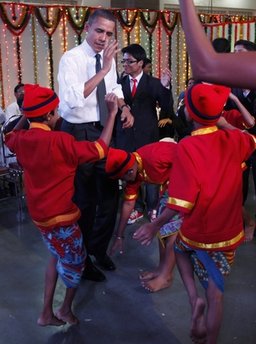 這些身穿鮮艷印度傳統(tǒng)服裝的孟買學(xué)生,當(dāng)天為遠(yuǎn)道而來的客人表演慶祝排燈節(jié)的舞蹈,他們搖擺著身姿,配以優(yōu)美的手勢,感染著在場的觀眾。孩子們邀請奧巴馬夫人米歇爾一起舞蹈,米歇爾熱情的加入,奧巴馬則在一旁靜靜觀看。不過最后,奧巴馬也被拉起來共舞,但有些呆板生硬的動(dòng)作令人忍俊不禁。