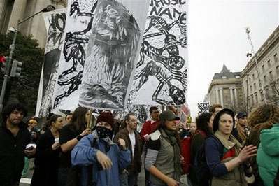 華盛頓的示威者打算“封鎖”國家稅務(wù)局,另一些示威者則會設(shè)法阻止K街的“發(fā)戰(zhàn)爭財(cái)者”。K街是華盛頓公司游說者的大本營。