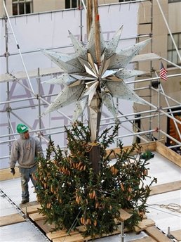 洛克菲勒中心從1933年,美國(guó)經(jīng)濟(jì)大蕭條期間,豎立第一顆圣誕樹,這項(xiàng)傳統(tǒng)延續(xù)了70多年,今年的圣誕樹是一株高21米的挪威翠松,由紐澤西的漢米頓家族所贈(zèng),上星期就已經(jīng)開始架設(shè)在中心廣場(chǎng),