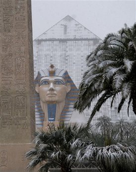 中新社12月19日電 拉斯維加斯是全球知名的賭城。這里夏天溫度常常超過40攝氏度,冬天白天的平均溫度也有15攝氏度。因?yàn)樘幵谏衬貛,這里還是全美濕度最低的大城市之一。但就在17日到18日早上,這個(gè)棕櫚搖曳的沙漠之城迎來了一場罕見的大雪。