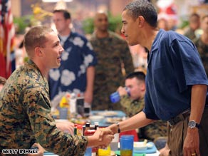 據(jù)CNN報(bào)道,正在夏威夷休假中的美國(guó)當(dāng)選總統(tǒng)奧巴馬,昨天慰問(wèn)了當(dāng)?shù)匾缓\婈憫?zhàn)隊(duì)基地,并和駐扎在那里的士兵及士兵家屬共進(jìn)圣誕晚餐。奧巴馬在美國(guó)海軍陸戰(zhàn)隊(duì)駐夏威夷瓦湖島(Oahu)的軍事基地里與士兵們一起共進(jìn)了一個(gè)有火雞,烤牛肉,火腿和香腸的傳統(tǒng)的圣誕晚餐。