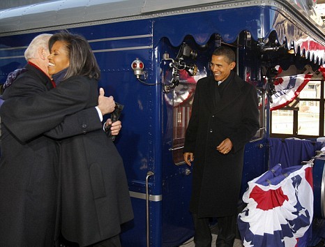 奧巴馬在乘坐專列由費城啟程前往首都華盛頓途中,開始總統(tǒng)就職的一系列活動。當(dāng)天也是其妻子米歇爾45歲的生日,他們在火車上慶祝,兩人沿途又向群眾揮手,很多人夾道歡呼,有人舉起寫上“米歇爾生日快樂”的標語牌。