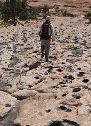 地質(zhì)學(xué)家認(rèn)為,地處亞利桑那州和猶他州交界的這片干旱的荒野,在1.9億年前可能是沙漠中的一片綠洲。此后,這里變成熱帶地區(qū),成為大陸漂移分裂前的整塊陸地的一部分。地質(zhì)學(xué)家溫斯頓·蔡爾在世界古生物學(xué)期刊《Palaios》上發(fā)表文章認(rèn)為,這里與撒哈拉沙漠的形成有相似之處,都是由風(fēng)吹動(dòng)沙丘形成的。而在遠(yuǎn)古時(shí)候,這些沙丘之間可能存在池塘。從留下的痕跡分析,有數(shù)量眾多的恐龍?jiān)?jīng)來到這里飲水。