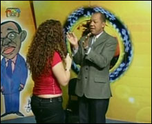 這位剽悍的紅衣女子,是與委內(nèi)瑞拉總統(tǒng)查韋斯同黨的國(guó)會(huì)議員薇瑞拉(Iris Varela)。一旁身穿灰色西裝的則是政論節(jié)目記者阿佐卡爾(Gustavo Azocar)。20日的現(xiàn)場(chǎng)節(jié)目中的激烈打斗讓全委內(nèi)瑞拉的觀眾目瞪口呆。