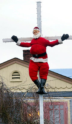 中新網(wǎng)12月24日電 美國華盛頓布萊摩頓居民康洛德最近對圣誕節(jié)彌漫的“消費(fèi)主義”十分反感,他的反感已經(jīng)不僅僅體現(xiàn)在避開購物中心和關(guān)掉電視這么簡單了,而是將圣誕老人釘在自家房前15英尺高的十字架上。