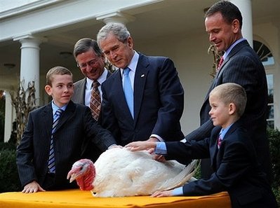 即將卸任的布什正經(jīng)歷他任期中最后的一些時刻:最后一次參加Tee Ball比賽,最后一次參加超級碗勝利慶典,“最后一次與火雞同臺”。