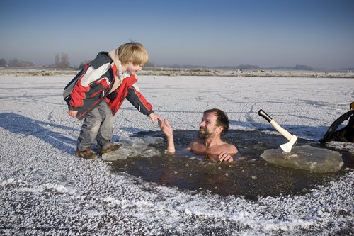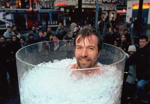 霍夫說:“我當(dāng)時和某人在公園散步,看到了冰。我突然冒出個想法:要是站到冰中會怎樣呢?我非常想試一下。于是,我脫掉衣服,在里面站立了30秒。出來后,我有一股強烈的愉悅感。從那以后,我每天都這樣做。”