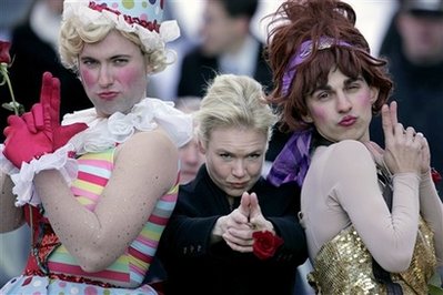 中新網(wǎng)2月6日電 據(jù)美聯(lián)社報道,5日哈佛大學(xué)的速食布丁劇團(tuán)將速食布丁年度女性大獎授予女星蕾妮•齊薇格。蕾妮•齊薇格按照以往慣例,帶領(lǐng)一群男扮女裝的學(xué)生們在哈佛校園中進(jìn)行一場盛大游行。