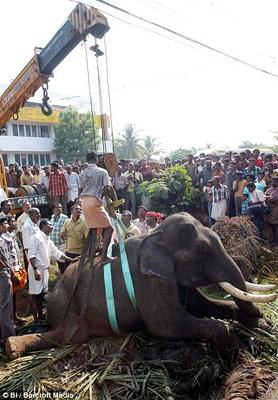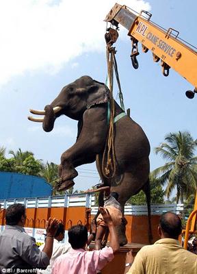 據(jù)英國《每日郵報(bào)》4月1日的報(bào)道,周二,印度喀拉拉邦一頭公象在交通繁忙的公路上被一輛卡車撞到,兩條后腿骨折和背部受傷,獸醫(yī)不得不動(dòng)用起重機(jī)來搬運(yùn)這個(gè)“龐然大物”。據(jù)報(bào)道,這頭大象高9英尺(約2.7米),重達(dá)6噸,剛剛從附近的一家印度教寺廟逃出。在事發(fā)現(xiàn)場,數(shù)百名觀眾正在觀看獸醫(yī)如何救治受傷的大象和如何將它搬離現(xiàn)場。一名獸醫(yī)表示,這頭大象體型龐大,情緒極不穩(wěn)定。不過,它此前一直生活在附近人來人往的寺廟,所以對人并不十分恐懼。在對大象做過全面評估后,他們決定從附近的建筑工地上征用一輛起重機(jī),將這頭大象吊到卡車上,將它運(yùn)往一家獸醫(yī)醫(yī)院。據(jù)悉,搬運(yùn)工作進(jìn)展得十分順利。不過,令人可悲的是,盡管獸醫(yī)在努力救治這頭大象,但由于它的傷勢過于嚴(yán)重,于當(dāng)天晚間死去。