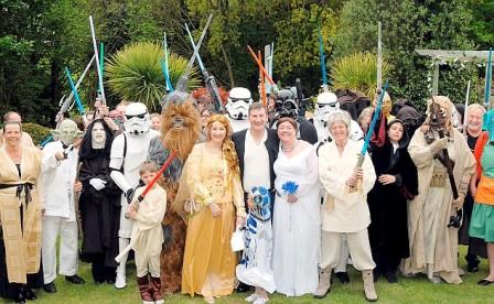 這對新人邀請了50名賓客在懷特島舉行了婚禮,他們打扮成 “絕地武士”和“帝國士兵”,而分別裝扮成萊婭公主以及漢•索洛的新娘和新郎才是當天真正的主角。