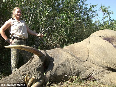在Teressa一箭射倒大象后,并不敢馬上上前。她在旁邊守了整整一夜后才鼓足勇氣上前查看,發(fā)現(xiàn)大象確實已經(jīng)死亡。感到萬分自豪的她,拿著自己所使用的弓箭與被射殺的大象合影留念。