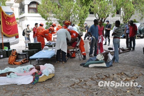 海地當?shù)貢r間14日9時,中國武警總醫(yī)院赴海地國際救援醫(yī)療分隊開設(shè)第一個流動醫(yī)療點,已為110名受傷的災(zāi)民提供醫(yī)療救助。海地總理禮賓官趕到醫(yī)療救助點,他握著來自中國武警總醫(yī)院的醫(yī)生的手說:“感謝中國國際救援隊,你們是第一支來總理府進行人道主義救助的救援隊”。