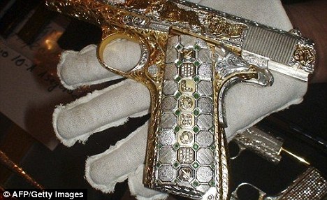 報(bào)道說,有3支沖鋒槍幾乎整個槍身都包覆黃金,并有一枝黃金制作的滅音器。一名顯然特別注重形象的幫派份子,他的手槍更是獨(dú)一無二,槍上鑲嵌了整排華麗的紅綠寶石和一個法拉利(Ferrari)徽記。