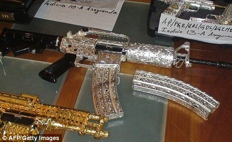 據(jù)報(bào)道,這些槍支顯示了幫派奢華份子如何花用他們不法的財(cái)富。照片顯示軍方在墨西哥西部一次突擊行動中,起出31支槍,大部分外表都包覆著黃金或白銀外皮,或鑲嵌著許多閃閃發(fā)光的鉆石。