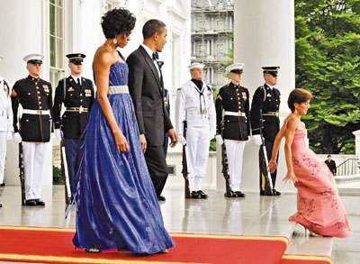 中新網5月21日電 據(jù)香港《文匯報》報道,美國總統(tǒng)奧巴馬19日在白宮設宴款待來訪的墨西哥總統(tǒng)時發(fā)生一段小插曲,白宮的禮儀官準備迎接貴賓時,忽然跌一跤,整個人坐在階梯上,受驚的她立刻站起來,開玩笑警告攝影記者不要拍照。