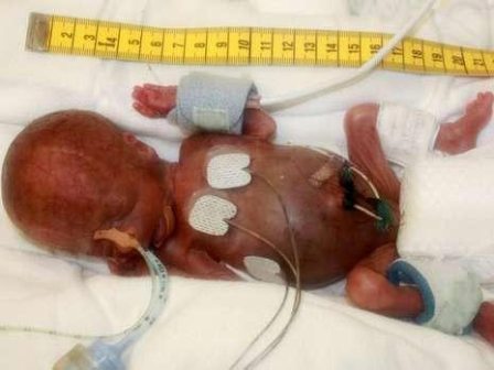這名男嬰于2009年6月出生,比預(yù)產(chǎn)期提前了15周。當(dāng)時他在母親體內(nèi)有危險,醫(yī)生立即實施了剖腹產(chǎn)。出生時男嬰極其纖弱,大小和一張A4紙差不多,體重只有275克,輕得像一塊黃油。醫(yī)生不得不把他放在保育箱里,但是仍然不能保證其成活。經(jīng)過6個月的精心護理,2009年12月,這名男嬰體重增加到3.7公斤,和一名足月的新生兒差不多大小,順利出院。