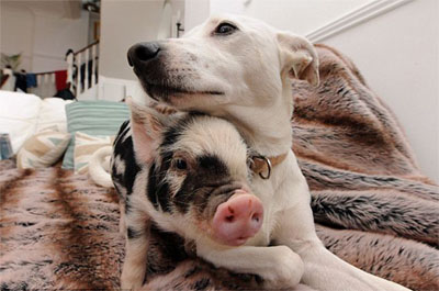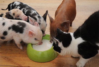 克羅夫特家的寵物“長老”是狗狗黛西和貓咪?送,這一狗一貓都不是吝嗇的小動物,它們愿意和迷你豬們分享自己的一切,包括床和食物。因此常常可見小豬們和貓咪躺在一起睡覺、一起喝牛奶;或是看到小豬黏在狗兒黛西身上,相互依偎。有時候好幾只豬集體霸占黛西的睡床,它寧愿看著小豬熟睡,自己卻坐得直挺挺地,不敢吵醒它們。