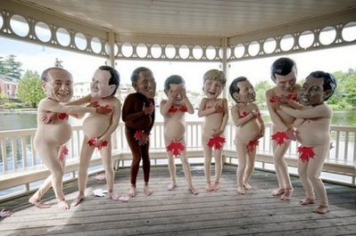 來自加拿大樂施會(huì)組織的幾名成員裝扮成八國首腦,他們帶上奧巴馬、默克爾等領(lǐng)導(dǎo)人的面具,身穿肉色緊身衣,看上去仿佛“赤身裸體”,而關(guān)鍵部位則用一片加拿大特有的紅葉遮羞。他們在鏡頭前搔首弄姿、大擺pose,欲以此嘲諷G8峰會(huì)。