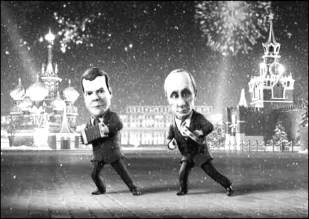 元旦夜晚,俄羅斯國家電視臺(tái)第一頻道突然出現(xiàn)了總統(tǒng)梅德韋杰夫和總理普京的形象,只是這次他們變成了3D卡通玩偶。在時(shí)長兩分半鐘的短片中,左邊的梅德韋杰夫拉著手風(fēng)琴,右邊的普京手搖鈴鼓,兩人在紅場上邊唱邊跳,共同評(píng)說2009年,不但諷刺了烏克蘭天然氣事件,還把梅、普共治體制幽默了一把。